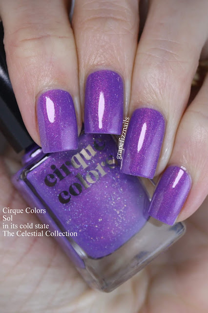 Sol is a gorgeous thermal that changes to purple when cold and baby pink when warm. It has vibrant pink shimmer and lots of holographic sparkles.