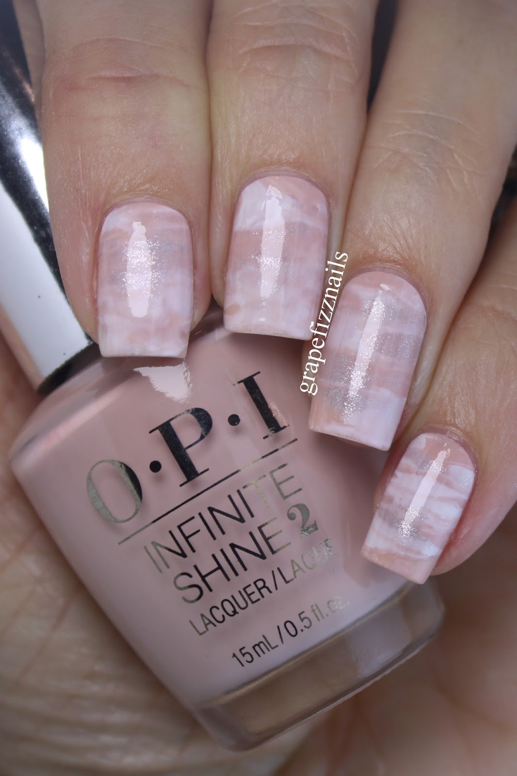 I put on a base coat of OPI Infinite Shine You're Blushing Again on my nails. On a glass surface, I put a layer of You're Blushing Again and a few dots of OPI Infinite Shine Non-Stop White and Go to Grayt Lengths. I took a toothpick and dragged the polish around horizontally and then picked up the design with a clear stamper and stamped it onto my nails. I topped it off with my fave top coat, NYC Grand Central Station.
